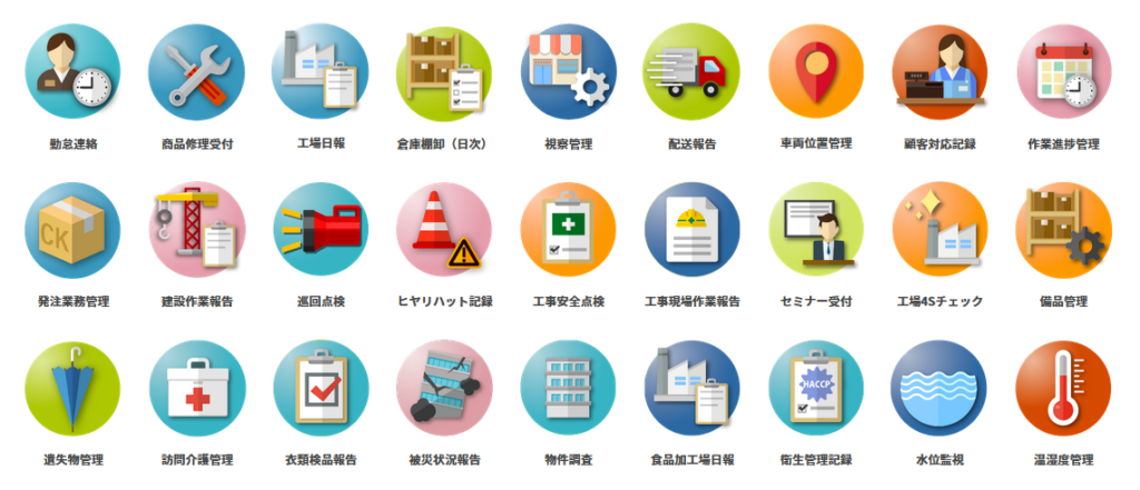 - 100種以上のテンプレートを使って、プログラミングをすることなく、現場の方や担当の方がスマホアプリ開発の専門的な知識が無くても作成できます。