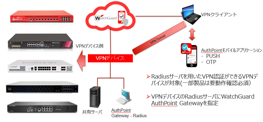 - リモートアクセスVPN(SSLVPN、IPSec VPN)をご利用のお客様(AuthPointで社内リソースアクセス時の認証を強化)